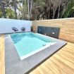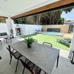 La zona exterior de la propiedad está diseñada para aprovechar al máximo el clima, con mobiliario de terraza que te invita a disfrutar de comidas al aire libre o simplemente relajarte en un entorno tranquilo. Además, cuenta con una gran piscina portátil, ideal para refrescarse y disfrutar del sol en los días más cálidos.